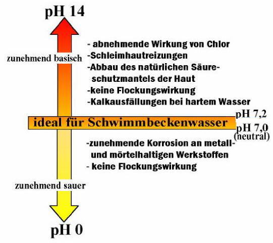 Der ph-Wert zeigt an, ob das Wasser basisch oder sauer ist. Voraussetzung für gutes Schwimmbeckenwasser ist ein pH- Wert von 7,0(neutral) bis 7,2 -auf keinen Fall höher!